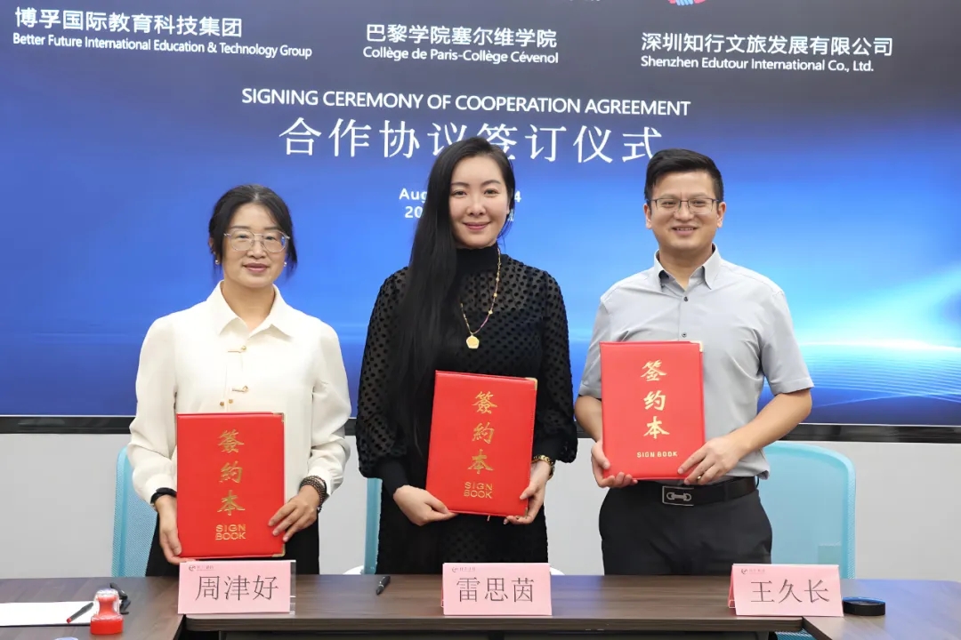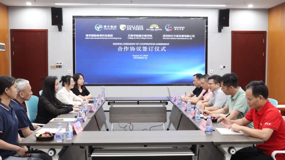 2024年8月21日上午,,,,尊龙时凯国际教育集团在开展国际教育业务方面迈出了坚实的一步。。集团董事长王久长校长、、、谢琳璘总裁、、谭正元副总裁、、黄智财副总裁和陈地长副总裁一道,,热情接待了法国巴黎学院塞尔维学院校长雷思茵女士、、中国区负责人梁伯柱先生、、、财务主管余子尉、、、行政助理Stella,,,以及深圳知行文旅公司执行董事周津好女士和吴穗婷女士一行,,,主宾三方一起举行了友好会谈并举行了隆重的合作协议签署仪式。。