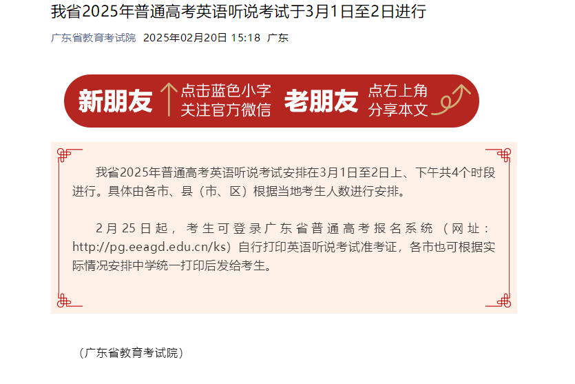 -> 广东省2025普通高考英语听说考试于3月1日至2日进行,,,2月25日打印准考证