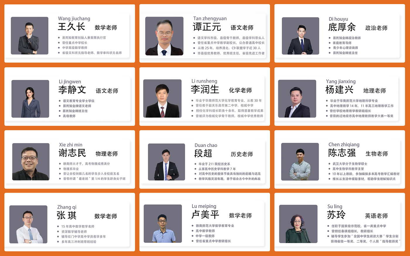 教师团队具有丰富的中高考教育教学及带班经验,,,,熟悉中高考学生群体及个体特点,,,,能以中高考考点为靶向,,,,精准定位、、有效提分;能提供专业优质的课堂教学方案构建完整全面的学科知识教学体系。。。。